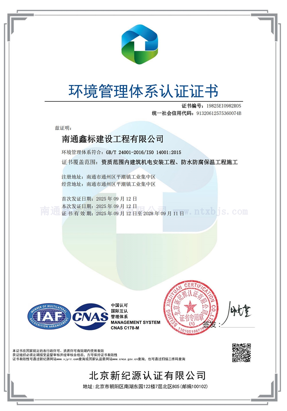 环境管理体系认证证书