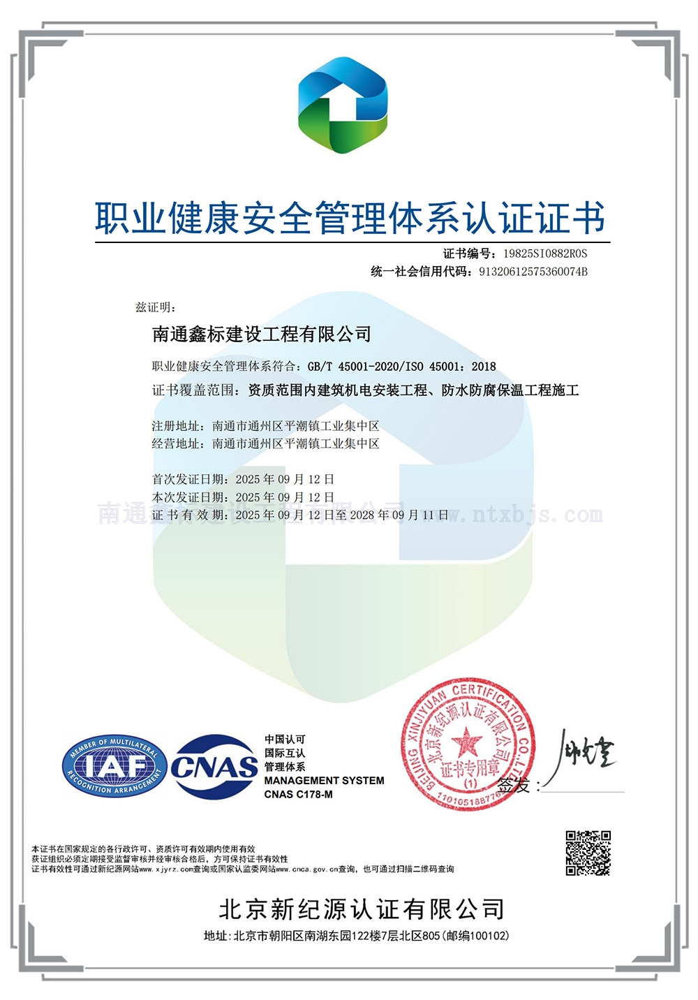 职业健康安全管理体系认证证书