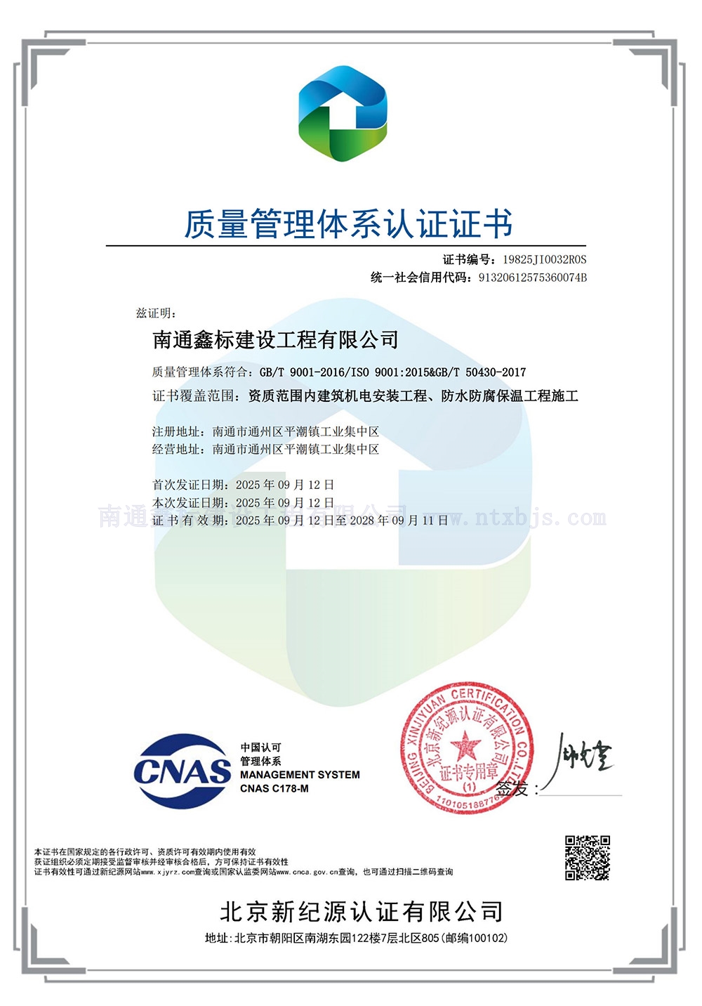 质量管理体系认证证书